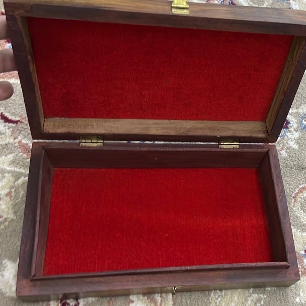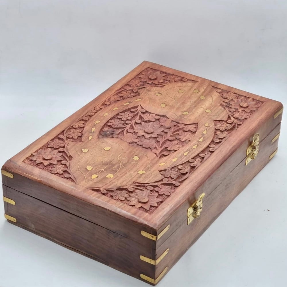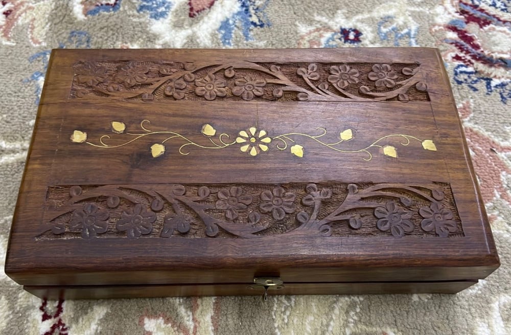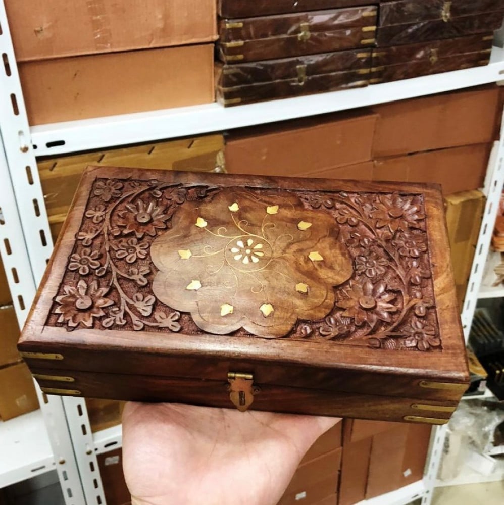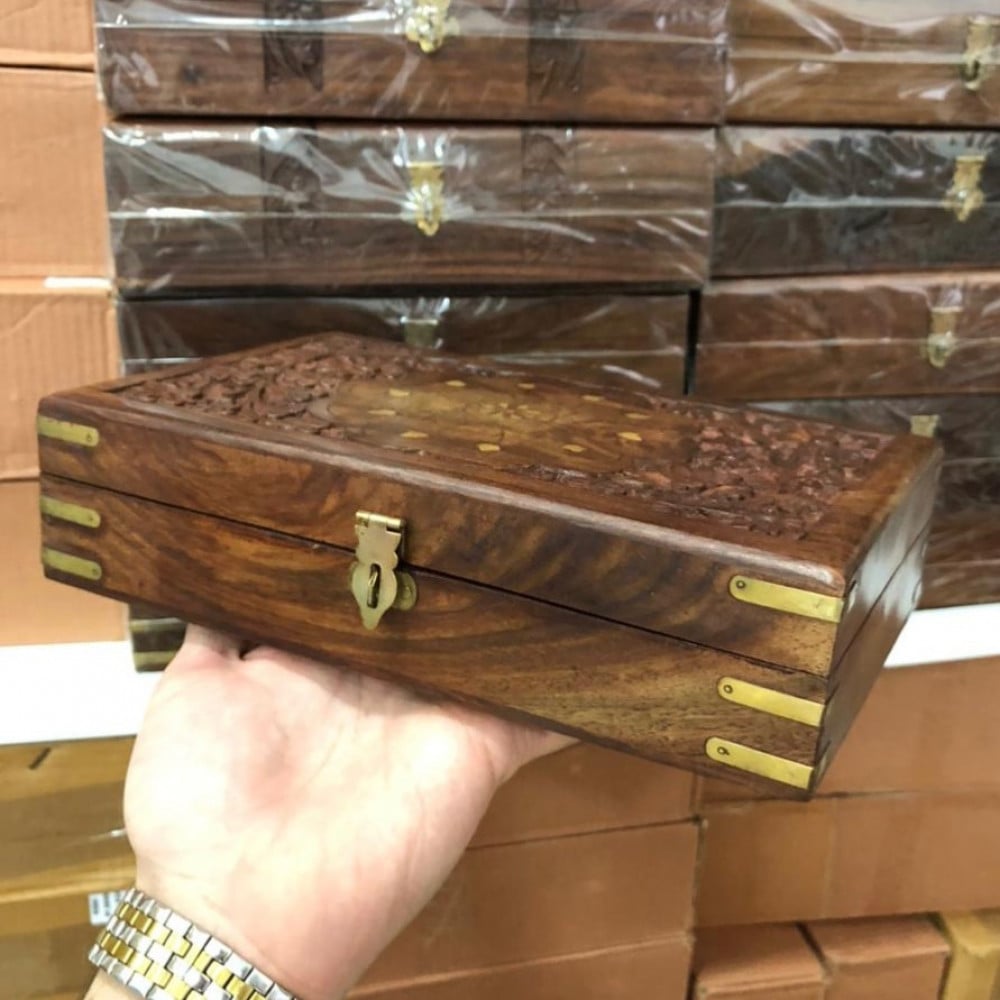 على علب هندية مزخرفة فاخرة جداً ، مصنعة من خشب طبيعي متين بجودة عالية ، عليها نقش يدوي فخم معمول مع النحاس الذهبي الجميل، يُستعمل لحفظ المقتنيات الفاخرة الثمينة ، مناسب للإهداء والإقتناء …
